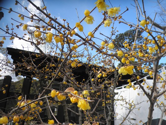 関所の門の裏にある「ロウバイ(蝋梅)」が、
