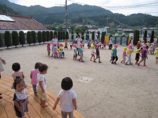 園庭では園児さんが土曜日の夏祭りに向けて盆踊りの練習しています