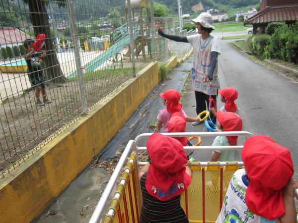 今日は一週間に一回のあか1くみさんのあさがお水やり当番の日です
