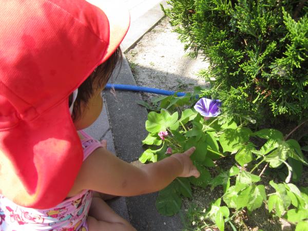 きれいに咲いているあさがおを見つけて嬉しそうに見つめていました(^^)