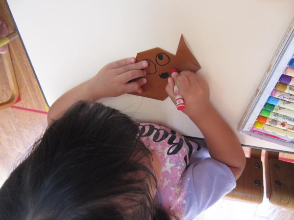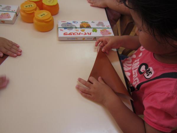 今日は折り紙を使ってたぬきを作りました。