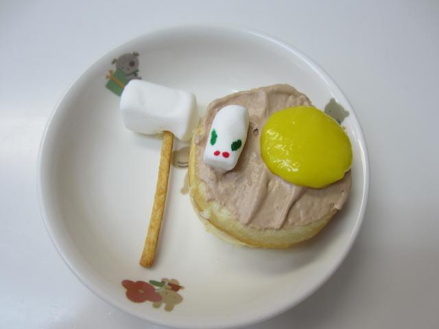 ケーキの横の杵はプリッツとマシュマロでできています。