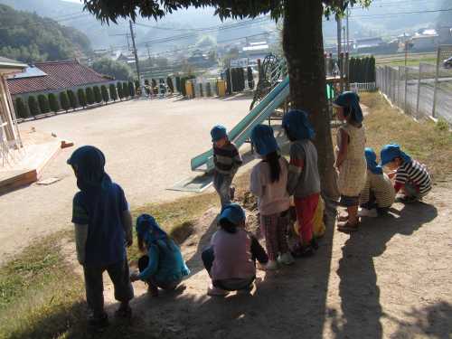 園庭で遊んでいると、「せんせい、たいへん!」とあおぐみさん。