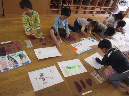 さつまいもは、形をよく見て下描きをした後ハサミで切ったり、絵の具で塗ったりました。