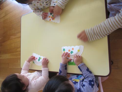 今日はいろんな形を紙皿にペタペタと貼って、製作をしました。