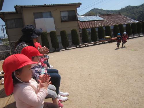 その後、園庭で遊んでいると、幼児のお兄さん、お姉さんたちがリレーをしていたので、みんなで応援しました。