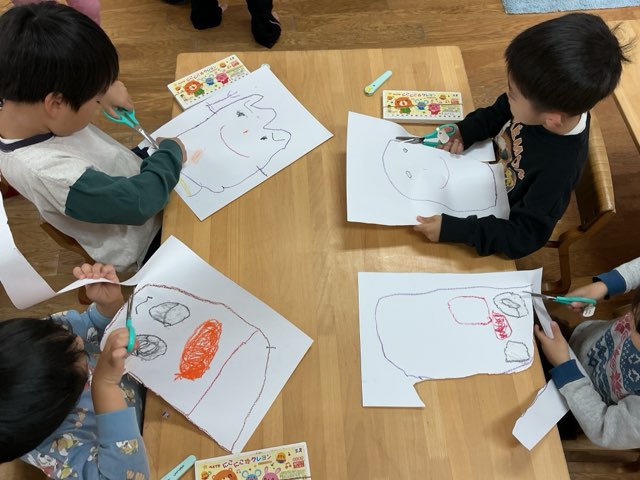 次に描いたさつまいもにそってハサミで切り、絵の具で色をつけました!