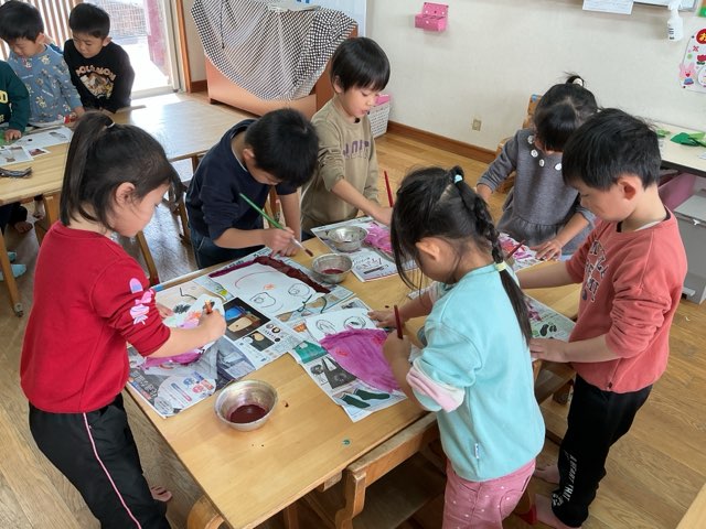 クレヨンで描いた部分だけ絵の具が弾き、不思議そうに見つめる子どもたちでした♪