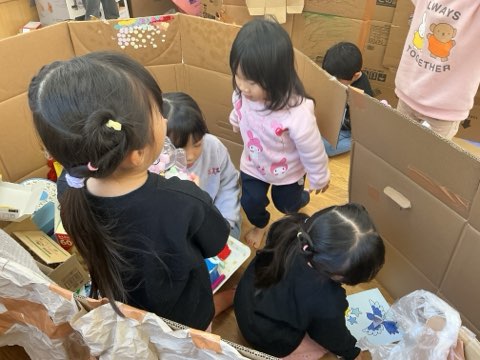 今日はもも組さんと一緒に廃材遊びをしました♪