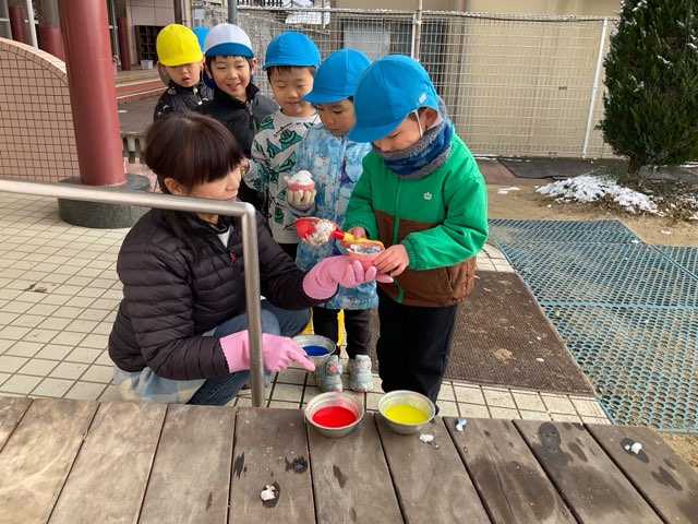 今日は雪でかき氷作りをしました。