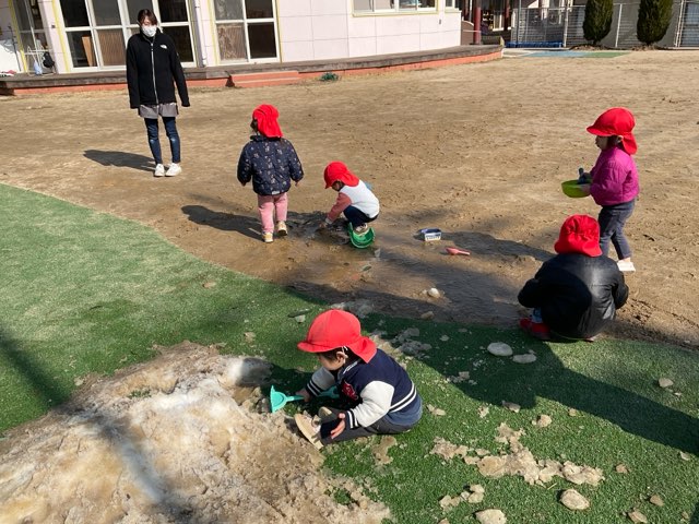 まだ雪が残っている園庭でスコップや型抜きのおもちゃを使いご飯を作ったりペタペタと固めて楽しんでいました。