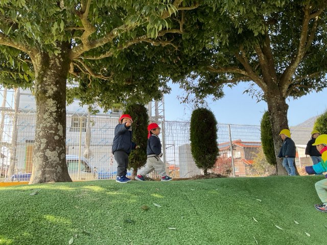 芝生の斜面の上では思い切り走ったり葉っぱを集めておには外ー!とまいて元気いっぱい楽しんでいました。