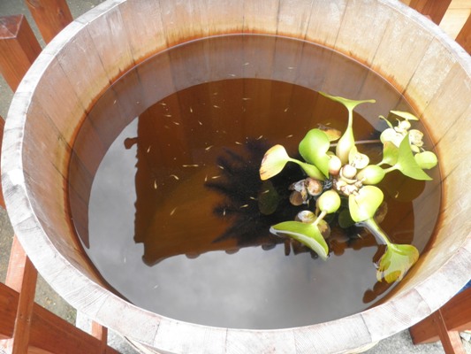 お内儀(かみ)さんが「天水桶」の中を覗いていました。