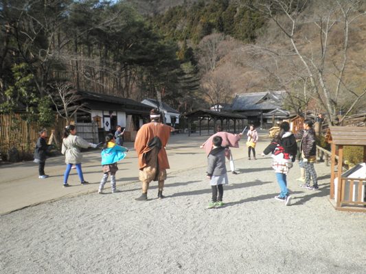 気温を考慮して屋内開催になった「忍者体験」の出発の様子から。