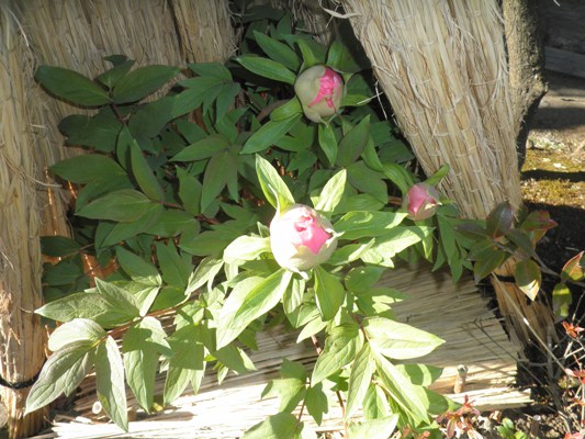 「黄金の茶室」の庭の外周に植えられている「寒牡丹」のうち、