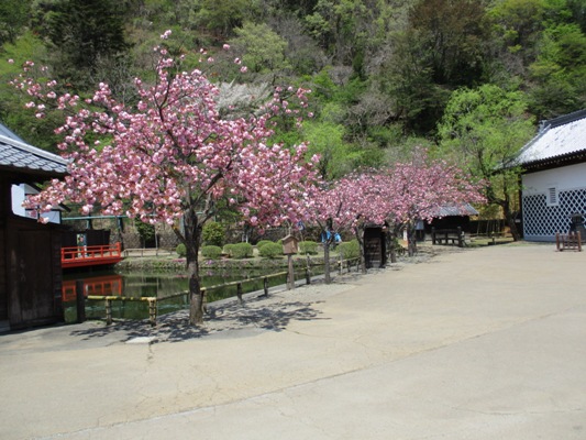 「ニャンまげ劇場」前の植え込みの中の「八重桜」です。