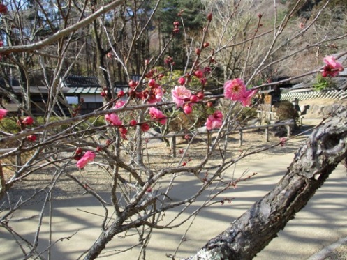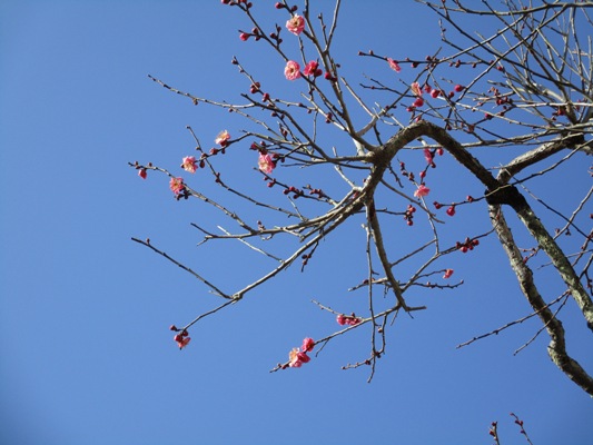 「商家街」入り口の左脇で開花が進む「梅」の古木を、