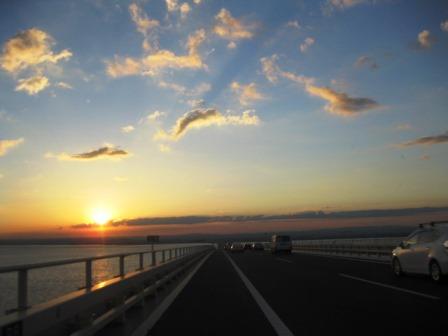 帰りのアクアラインのトンネルを出たら朝日が、あまりの美しさに