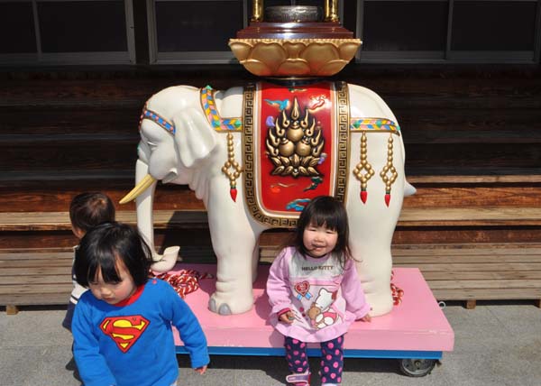 花御堂を背中に乗せた白い象を、子どもたちで引っ張って参道を行進しました。