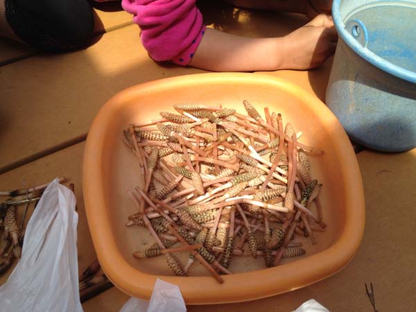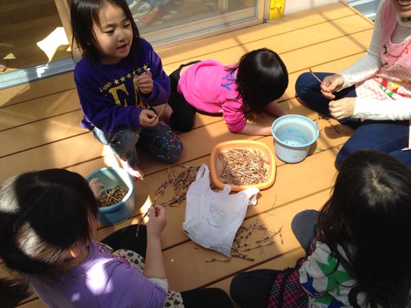 今日は空がまぶしいほどの天気で、子どもたちは本堂の裏でツクシを採りました。