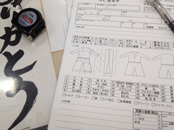 毎日、衣類の採寸やシミ汚れのチェックをするカルテ作成を