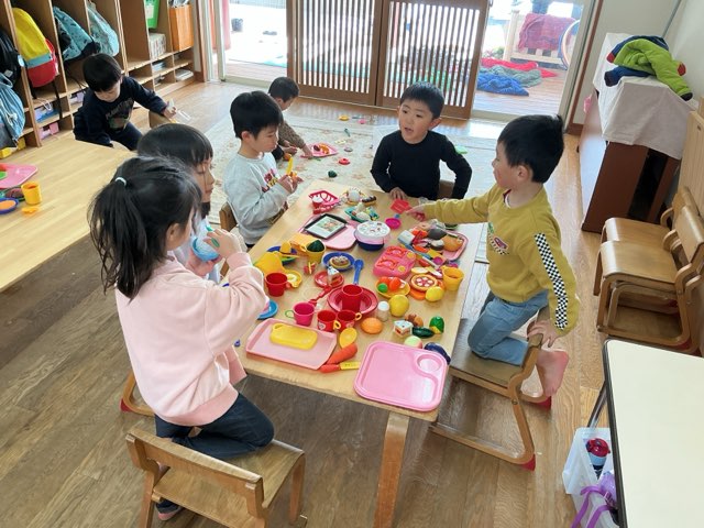 前日に積もった雪を触りに出たり、室内でままごとをしたりと異年齢同士で遊べるのを喜んでいました^_^