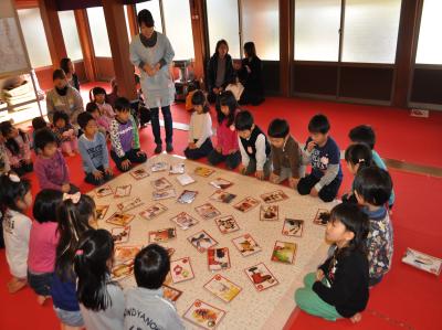 みんなで本堂に移動し、各クラスごとにかるたとりをします。