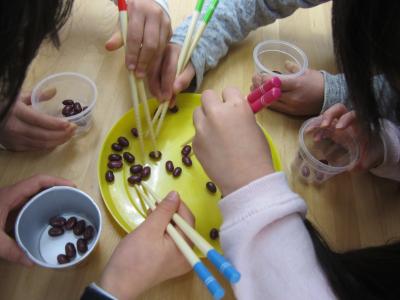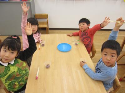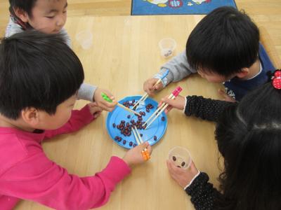 今日はその節分にちなんで、豆を使った遊びをしました。