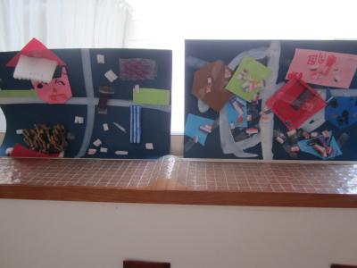 まず白い絵の具で道路を描きその上に廃材を使って街を作ります!