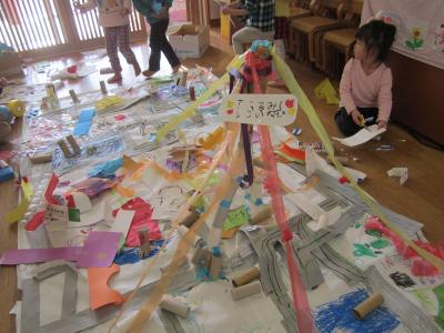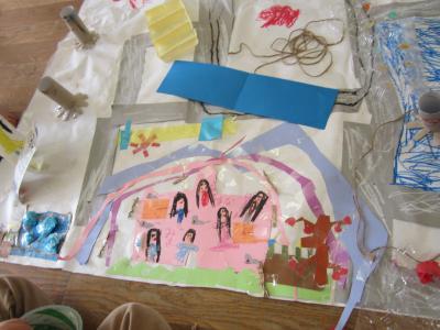 模造紙いっぱいに道路をつくったあと、それぞれのイメージを表現していきました。廃材、スズランテープ、フラワー紙、画用紙など、様々な素材を使って、自由に描いたり、切ったり、貼ったりしていきました。