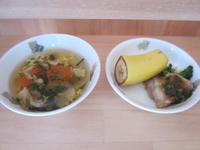 給食は鶏肉のねぎみそかけ、かきたま汁、バナナです。