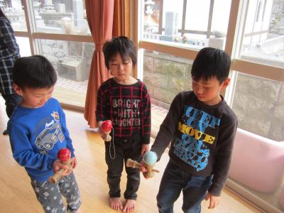 けん玉の体験では、持ち方から丁寧に教えてもらい、