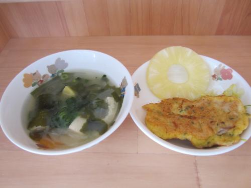 豚肉ピカタと豆腐の味噌汁とパイナップルです。