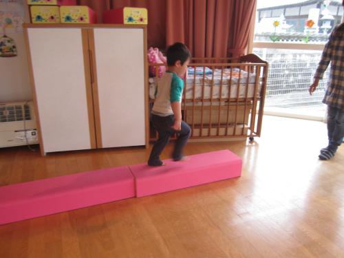 平均台を落ちないように歩いて