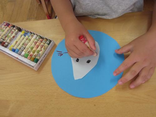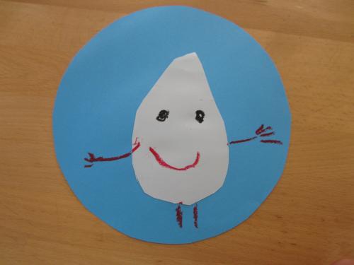 しずくの形に画用紙をはさみで切り、顔を描いてあげました。