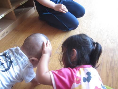 0歳児さんが泣いていると、そばにきてよしよしと頭をなでてくれる1歳児さん。