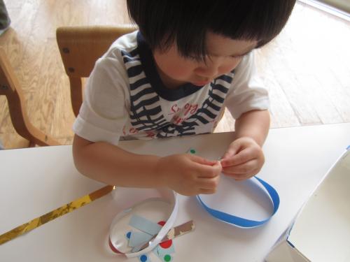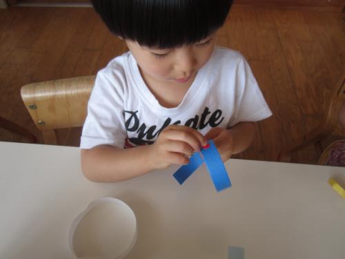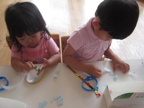今日は七夕飾りの製作で、細長い紙やテープにシールを貼りました。