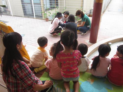 先生たちがヨーヨーの準備をしているのを見学中です。