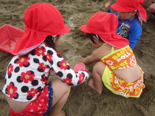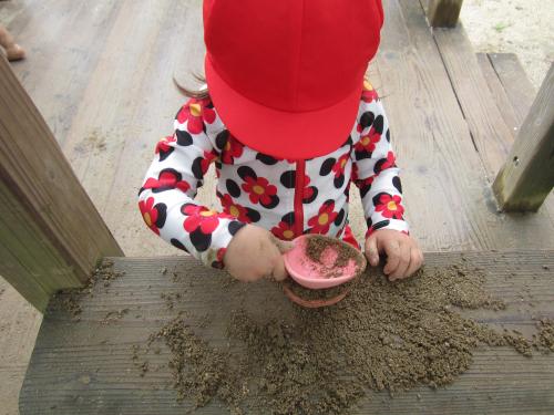 「ペタペタ」「ぎゅっぎゅ」とカップに砂を入れたり、