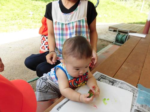 その後、好きな色の絵の具をつけて、ポンポンとスタンプ遊びを楽しみました。