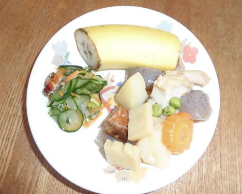 給食はいりどりと鰻冊(うざく)とバナナです。