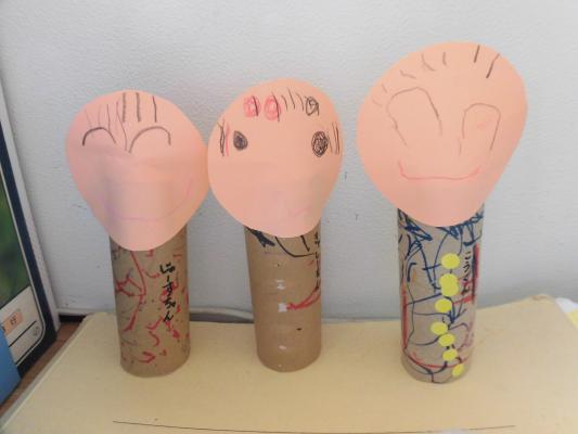 その後、トイレットペーパーの芯にマジックで模様を描いたり