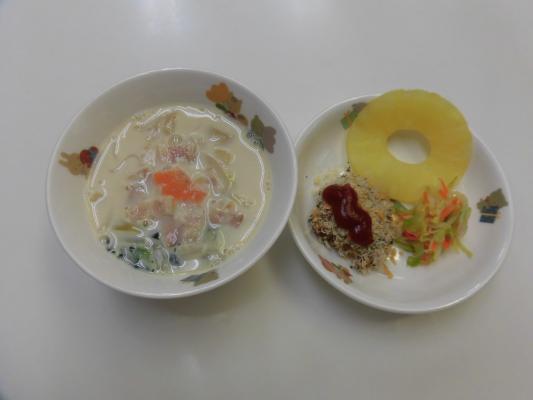 豚肉のパン粉焼き、豆乳スープ、パイナップルです。