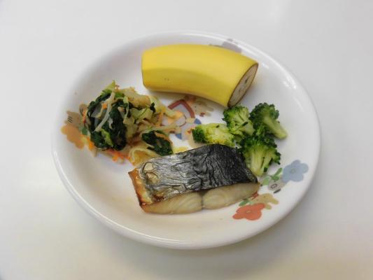 さわらの照り焼き、ほうれん草のおひたし、バナナです。