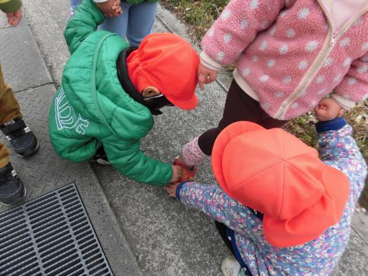 お散歩では手をつないでもらい、「こっちよ」と優しくリードしてもらう子どもたち。