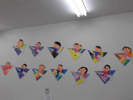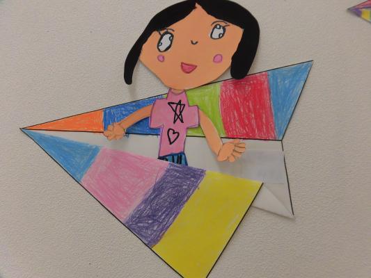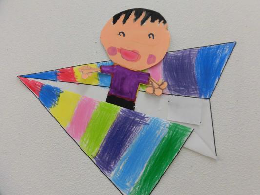 まっしろな紙ひこうきに、丁寧に色塗りをして、