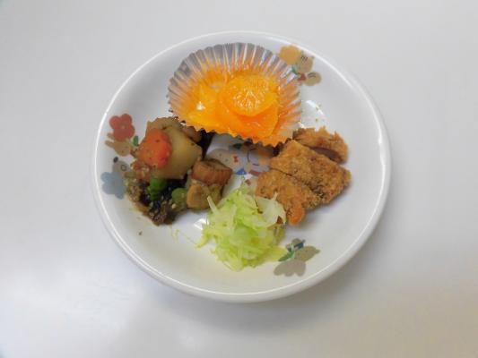 今日の給食はヒレカツ、まごわやさしい煮、みかんです。