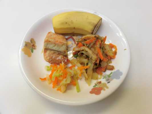 給食は鮭のムニエル、茎わかめとじゃがいものきんぴら、バナナです。