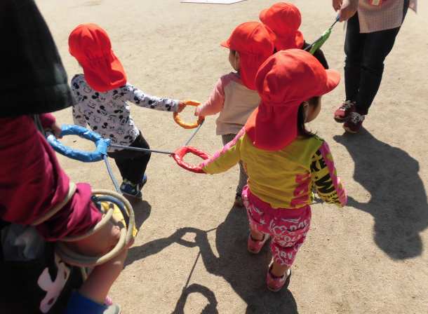 あか1くみさんも「ピッピッ」と笛の合図に合わせて自分のマークが貼ってある誘導ロープを握って頑張って歩いています。