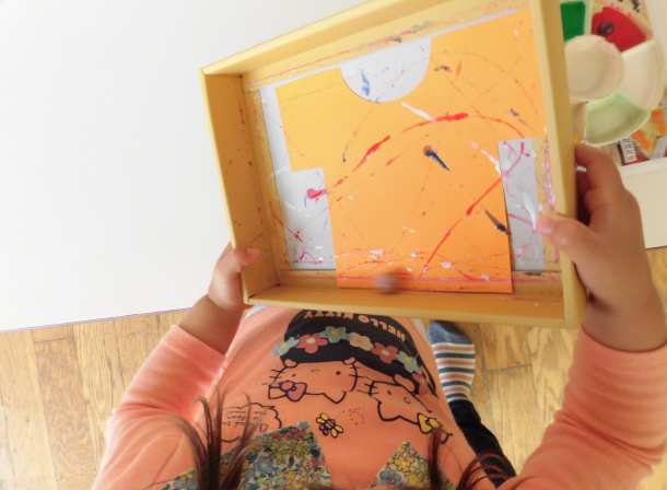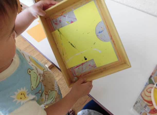 絵の具の付いたビー玉を画用紙の上に転がして、
